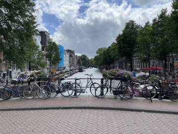 Having consumed the frites, we then wandered around the city. We explored many of the side streets and then made our way to the canals. We were amazed by the sheer amount of bicycles that we encountered- it seemed that the bike traffic may have outnumbered the foot traffic and you had to keep your head on a swivel to avoid veering into the path of speeding bikes hurtling at you. The episode of Ted Lasso that depicts a team trip to Amsterdam captures this chaos perfectly when Rebecca ends up in a canal dodging bikes! The bridges over each of the canals were decorated with flowers in pretty planters and were adorned with even more bicycles- those that were not currently being ridden around the city. We enjoyed seeing all of the different flavors and styles of houseboats docked along the canals and sat for a bit and watched the boat traffic inside the canals- its own little highway.