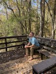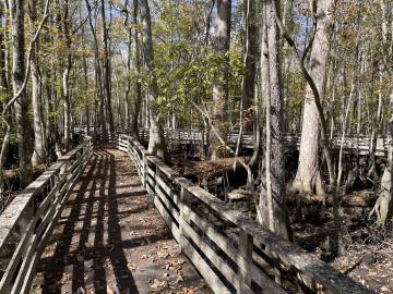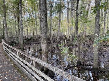 On our way back to the visitor’s center an employee appeared on the boardwalk about 50 yards in front of us and very calmly but firmly announced for us to stop because there was a water moccasin somewhere between us and him. We didn’t have to be told twice and stopped in our tracks, heads on a swivel. Snake stick in hand, the employee inched forward along the boardwalk in search of the snake. What he found (about 10 yards in front of us) was a nonvenomous, shy, and very common, brown water snake. A visitor that had passed by her previously had made the common mistake of misidentifying her. He invited us up to her and pointed out the features that often get them confused with water moccasins (a long mouth which enables them to grip onto fish gives them more of a triangular head which people mistake for a venomous snake as well as their shorter and wider body). She seemed nonplussed by our impromptu nature class and lay politely coiled so we could learn about her. The employee decided she was fine where she was and didn’t need to be shooed off the boardwalk since the center was about to close for the day. We headed back to the car and plugged in Becky’s address into the GPS.