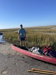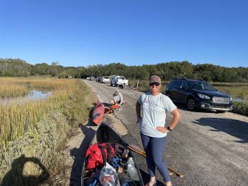 Once we arrived at the Gadsenville Road put-in and parking lot, we didn’t have to wait long. Joey Geiger was the trip leader and pulled in right after we did. Scott and I were happy that he would be leading us and could impart his expertise to navigate our way through the complex labyrinth of tidal creeks and marshes on the 3.5 mile outbound paddle to the island where we would be camping that night.