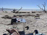 We had been advised by some campers already on the island to avoid the wooded area because the mosquitos were worse there because of the vegetation. Scott and I picked an area that was above the high tide line and not too close to the woods and Joey found some trees a little outside the woods to hang his camping hammock. We did a quick camp setup and then went to check out the “boneyard” beach which is an area of the island where the shore has been eroded away by the tides, winds, and hurricanes and have left dead trees on the shore. Some are still rooted and are in varying degrees of uprightness, and some are driftwood. At high tide the waves crash dramatically into the trees. The overall effect at either tide is a little eerie and looks like an abstract art exhibit.