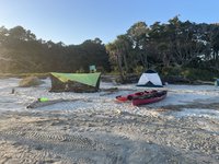 We relaxed for the rest of the afternoon, entertaining ourselves with hammocking, dips in the ocean, and strolls down the beach. The mosquitos that we had been warned of appeared about 5 pm and Scott and Joey set up the Nemo Bugout tent that Scott had brought to give us respite from the little vampires who were relentless in their pursuit of our blood. From our safe haven we were able to make our dinners and still enjoy the beach and waves. We made a little campfire outside the tent which in theory helped deter the mosquitos, but in reality I don’t think they were discouraged one bit. Despite the mosquitos we were still able to enjoy the sunset and the changing colors over the ocean and island as the sun retreated were beautiful. After the sunset, we retired to our tents and hammocks, tired but satisfied after a fun day.