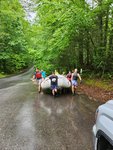 Saturday afternoon several things happened that demonstrated the core value of community in the club. The section 3.5 kayaking trip and rafting trip converged at the end of their runs and ended up at Woodall Shoals at the same time. One of the kayakers was having her PFD on section 3.5 and she encountered trouble at Woodall. which is a very long and technical section of the river. She unfortunately became separated from her boat, finding herself more or less stranded in the middle of the rapid. Thankfully Adam Mobley, Garrick Taylor, Kenny Anderson, and Clayton Burton jumped into action and helped get her to shore and Clayton piloted her boat down the remaining stretch of rapid. While Clayton was helping with that, the members of the raft trip started the long trek back up from the river to the parking lot with the raft. The raft somehow seemed heavier at the end of the trip than at the start, and it certainly wasn’t light at the start! We carried it just a few yards at a time before having to set it down to rest and regroup. When we were about halfway up the hill and rapidly running out of steam, down the trail came about four of the members from Mike Barnes’ raft to help us with our raft. They grabbed onto it and relieved our burden despite having just made the same treacherous trip a few minutes before with their own raft. A few minutes after loading up the rafts onto the trailer, Clayton appeared from the trail carrying Kendra Hathway’s kayak after he had heard that she had a compromised shoulder. Those stories are just the ones that I personally witnessed, I can guarantee that there are tons that I didn’t see or hear about and demonstrated what FPC stands for, which is members helping members.