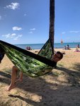 We found a pancake house to have lunch at, ate way too much, and remembered why big meals pair poorly with adventure when we felt bloated and lethargic after. We decided to make one more visit to Waikiki Beach for a final hammocking before we had to headed to the airport. Scott jumped in the water for a farewell dip in the Hawaiian surf and we napped and digested. Sadly it was time to pack up and head to the Honolulu airport and we did so reluctantly, not wanting our trip to end. We did one final pack and repack of our stuff so that we were ready to grab our bags and go when we dropped off the rental car, and jettisoned any of the food that wouldn’t be allowed through customs (apples, sandwich meat, etc.). We dropped off the very sandy rental car, having put close to 900 miles on it during our 10 day stay, and headed to our gate. As the plane lifted up over Honolulu we were treated to one final and stunning Honolulu sunset as we bid a hui hou to Oahu.