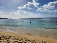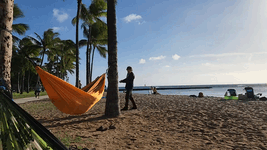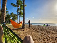Next we headed to Waikiki beach. Scott had wanted to rent a surfboard and surf but the waves were too tame today on this side of the island, so he settled for swimming and hammocking. We enjoyed floating around in the water and then heading to the hammocks for a nap. The beach at Waikiki was perfect for hammocking because it had palm trees just a few yards from the water and they provided just enough shade. (While I was lounging in my hammock an apparently schizophrenic homeless man wandered alarmingly close to my hammock and began wildly gesticulating. I was cocooned in my hammock and oblivious. Scott happened to notice, and instead of shooing him away from me, whipped out his phone and started filming the gesticulations in time-lapse mode so he would have an entertaining video for perpetuity.)