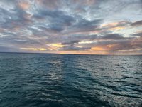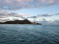 We made it to our catamaran that was beached on the sand in front of the Waikiki highrise hotels and waded through the surf to climb aboard. In no time we had their signature mai-tai drinks in hand. The crewmen ran through the rules of the vessel (no pooping allowed in their toilet as they were sailors, not plumbers) and asked if we were ready to get boozy and cruisey, and our catamaran set sail. One of the crew blew a conch shell that sounded exactly like a ship’s foghorn to let surfers know to make way for the boat. The sky was brilliant with just enough clouds to give dramatic shadows with the waning light. We made our way out into the open water and watched the sun drop lower and lower until it dipped below the horizon. Once we were a little ways off the beach they unfurled the colorful sails. The boat was heading north towards Diamond Head and we eventually got into some bigger surf. Scott and I had positioned ourselves at the bow and we had all been warned by the crew that we might have some waves crash over the boat. Duly warned we took our chances, fully expecting to get doused. Sure enough, a few moments later we encountered the first huge wave and got drenched but thankfully the water was warm. The sea water that made its way into our mai-tais actually enhanced their flavor, as well as the overall experience and we laughed every time another big wave hit us. I love catamarans and sunset cruises and this one checked all the boxes and it was one of the best experiences of the whole trip, certainly qualifying as a “thing to do in the place you’re supposed to do it.”