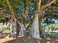 This was my first real foray into Honolulu and I was treated to a vivid rainbow when we got near the city. Scott had found a reliable place to park in Waikiki and we spent some time walking on the beach and the beachfront park on our way to the catamaran. This was my first time seeing the unusual and sprawling banyan trees up close and personal and I was mesmerized by their unique “accessory trunks” which sprout off the main trunk and allow the tree to seemingly spread out indefinitely. They looked like they came out of a fantasy movie and the amount of birdlife housed inside them was remarkable.