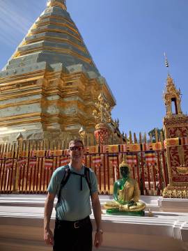 The wife/mother was a teacher in South Korea and spoke good enough English that we were able to communicate. We each inquired about the other’s time in Thailand thus far and found out about their occupations (she was an elementary school teacher and had the same elementary school teacher vibes of every American teacher- we quickly discovered that this energy is universal and has no ties or allegiance to any one particular country). We shared information about what part of our respective countries we were from, as well as the weather back home (they were also escaping the cold). She told us that her family’s favorite part of their Thai vacation so far was the cheap massages and they each had gotten one a day during their trip. Scott and I got a kick out of this authentic interaction and the family seemed to as well; in fact, we took selfies along the route with them and had our taxi driver take a group picture of us when we reached Doi Suthep.