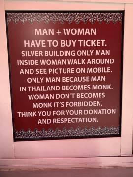 After our new friends were dropped off, Scott and I asked to be taken to the nearby Wat Sri Suphan, or the Silver Temple. We paid our admission, read the placards at the entrance, and then went in. I couldn’t tell you what the inside of the Silver Temple looks like because “SILVER BUILDING ONLY MAN INSIDE WOMAN WALK AROUND AND SEE PICTURE ON MOBILE. ONLY MAN BECAUSE MAN IN THAILAND BECOMES MONK. WOMAN DON’T BECOMES MONK ITS FORBIDDEN. THINK YOU FOR YOUR DONATION AND RESPECTATION.” I didn’t bother looking it up on my mobile and sat outside and took pictures of Scott who was cheekily posing with the “Only Men Inside” signs. (His report: “It looked like all the other wats. There was a buddha and pssst… it wasn’t even silver, it was gold.”)1 We did happen to see a woman trying to go inside the forbidden temple and an apoplectic employee quickly intercept her as he chastened her and explained to her the error of her ways.