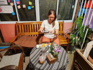 We had decided to try out Tikky Cafe for dinner, based on the recommendation from American travellers that we had met on our first night in Chiang Mai. We chose to walk the 3.5 km there to see more of the city. Along the way we passed a “Women’s Massage Center by Ex-Prisoners” and were perplexed as to what the heck that meant. Massages only for women? Or by women? Women “ex-prisoners” I suppose? So many questions. (Ahh, a quick Google search reveals that it is staffed by women who were formerly incarcerated and received vocational Thai massage training in prison.) We reached the restaurant and sat outside to wait for a table because it was quite crowded (always a good sign).