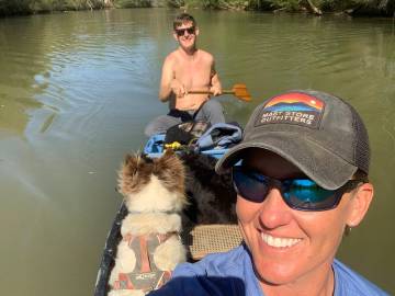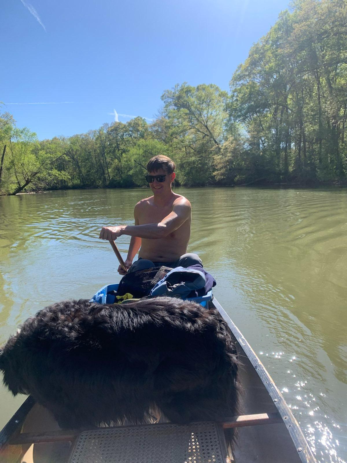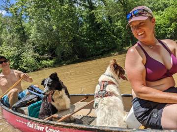 The Saluda river is right in between my apartment and Scott’s house so we took advantage of its proximity and enjoyed a few canoe trips to “Ant Island” with the dogs and a few trips down it on tubes. The dogs have turned into excellent canoe passengers and get excited about paddling with us. Ollie likes to bite at the water coming off the oars and Andi likes to stalk things from the comfort and safety of her vessel. It can be squirrely when they both decide to move around the canoe at the same time but the more often we take them out, the better they are getting at being still and sometimes will even lie down. Andi’s confidence level swimming has increased since we got her a doggy life vest. Although she still needs some coaxing, she is now more comfortable swimming back and forth between Scott and I. She enjoys investigating the little island and Ollie loves standing in the water, smacking, splashing, and barking at it.