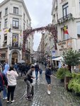 As we made the 15 minute walk to our city center lodging, the Hotel Floris Arlequin Grand-Place, we enjoyed seeing that each of the side streets had been extensively decorated and each had their own individual theme. Evidently they had been installed to commemorate the 125th anniversary of the famous Belgian painter Rene Magritte. It was elaborate and gave the city a certain charm and whimsical feel. Some of the ones we saw: flowers of every variety and iteration, umbrellas, bicycles, and birdcages. https://www.brusselstimes.com/573353/city-of-brussels-decorated-with-magritte-inspired-motifs