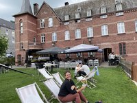 It was a short walk although quite hilly and when we arrived I was excited to see hundreds of hydrangea bushes surrounding the old building. We were happy to see that the serving area for the brewery was located outside on a manicured lawn with lots of outdoor seating overlooking the Meuse river valley and happily sipped our Leffe while enjoying the views. We coined the brewery “Belgian Community Tap” as a shout out to my favorite taproom back home. Scott quickly spied “castely shit” on the opposite hillside and was intrigued.
