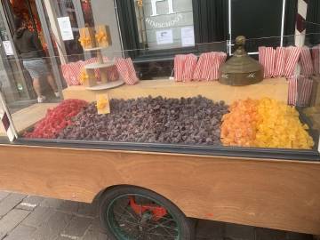 As we headed back to get ready for the wedding that evening we were struck (not literally because I was watching out for the both of us since we were walking on cobblestones and we know how Scott doesn’t respect them as a road surface) by the juxtaposition of the medieval Gravensteen and the modern world that had been built up around it- specifically watching the trolley cars, cars, motorcycles and bikes whizzing around its base. On our walk back we stopped at one of the candy stalls to get some of the famous Ghent cuberdons, or Ghent noses, which are conical purple raspberry flavored jelly candy that look like little noses. They were ok but I can see why the waffles and frites are more famous.
