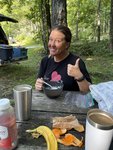 The club hosted a cookout on Saturday night and the group reconvened in time for that. We even had some members that were paddling elsewhere that weekend join up. Our FPC president Adam Mobley manned the newly purchased griddle with ease and turned out some burgers and hotdogs for the hungry group. (Thanks Patrick Walsh for doing the shopping.) Joe Kager treated the group to a campfire dutch oven cherry cobbler.