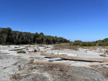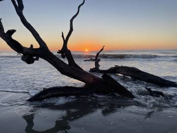 We had been advised by some campers already on the island to avoid the wooded area because the mosquitos were worse there because of the vegetation. Scott and I picked an area that was above the high tide line and not too close to the woods and Joey found some trees a little outside the woods to hang his camping hammock. We did a quick camp setup and then went to check out the “boneyard” beach which is an area of the island where the shore has been eroded away by the tides, winds, and hurricanes and have left dead trees on the shore. Some are still rooted and are in varying degrees of uprightness, and some are driftwood. At high tide the waves crash dramatically into the trees. The overall effect at either tide is a little eerie and looks like an abstract art exhibit.