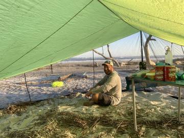 We all started off down the beach to talk to the other island campers and see if they had any clues. We were guessing that it must have been one of the guys that was in the camping spot that Joey had taken over once they left so we were in search of them or anyone that might have seen them (one was on a jet ski and one was on a standup paddleboard). While we were speaking with the other campers Joey received multiple phone calls from an unknown number. He finally answered and lo and behold it was the guy that had mistakenly grabbed his stuff. He was still on the island and was actually just a few yards away from Joey. They connected and the guy apologized profusely- his friend had asked him to bring his gear bag to him since he was on his SUP fishing on the other side of the island and he had mistakenly grabbed Joey’s stuff in addition to his friends. Thankfully they discovered it before they left the island but the guy assured us he would have come back with it as soon as they realized the mistake. The guys gave Joey a pound of bacon as a consolation prize and we all got a good laugh out of the experience. I was quite impressed by how composed Joey stayed- I think I would have been in panic mode!