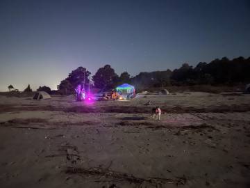 We relaxed for the rest of the afternoon, entertaining ourselves with hammocking, dips in the ocean, and strolls down the beach. The mosquitos that we had been warned of appeared about 5 pm and Scott and Joey set up the Nemo Bugout tent that Scott had brought to give us respite from the little vampires who were relentless in their pursuit of our blood. From our safe haven we were able to make our dinners and still enjoy the beach and waves. We made a little campfire outside the tent which in theory helped deter the mosquitos, but in reality I don’t think they were discouraged one bit. Despite the mosquitos we were still able to enjoy the sunset and the changing colors over the ocean and island as the sun retreated were beautiful. After the sunset, we retired to our tents and hammocks, tired but satisfied after a fun day.