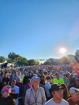 We arrived in Mt P with just enough time to walk past all the holding corrals and up to view the start (we were assigned corral D based on our estimated completion time and the corrals stretch nearly a mile and went all the way back to K I believe) and for one last potty stop where the lines for the banks of porta potties were purported via one of my Facebook running groups to be less crowded than the ones towards the back corrals and I think that was accurate. (Observation: I seem to talk about bathrooms a lot in this blog.)