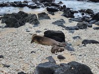 Scott picked me up and told me about his Ka’ena Point hike. It was 7.5 miles and it took him about 2.5 hours. The surf was much calmer today although it was still quite windy. When he finally came up on the actual point he encountered a fenced in area that was initially perplexing. It became apparent when he saw some other hikers that entered the enclosed area via a gate that this was a way to protect the wildlife and ground nesting birds from the invasive species (cats, mongoose, etc) that might threaten them. He came across a napping monk seal and chose this spot to stop and eat his lunch. He then exited the western exit of the enclosure to determine if there was another path that went around the point outside the fenced in area. He saw more nesting birds and it was stinky because of their presence. He continued along that trail until he came to a washout and then realized he had missed a spur that went around this impassable area. He took the spur for a bit before calling it quits and turned around since he had to come collect me. On the hike back he saw some off-road vehicles, some people fishing, and a few campers. I was glad that he had been able to do something fun while I worked and I enjoyed hearing about his hike.
