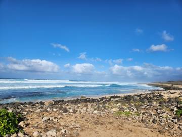 When our trail ride finished, I hopped off and hustled over to the arena to teach a few lessons. Scott helped take care of the horses and then headed out for a quick 2.5 mile hike at nearby Ka’ena Point State Park until it was time to pick me up and take me back to Kawailoa. (While it was a lot of travel back and forth, the facilities were only about 10 minutes away from each other so it wasn’t terrible.) The hike paralleled the rugged North Shore coast line and he got to see huge surf along the way, as well as remnants of the old railroad that used to run the perimeter of Oahu.