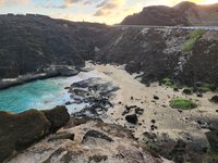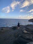 Later in the day we decided to venture out and go south to explore the area from Kailua towards Honolulu along an area called the Kaiwi State Scenic Shoreline. We stopped at Waimanalo Beach first and sipped some local beers that we had picked up the day before while overlooking the ocean (they were a miss- I typically like nearly all beers, but these were too bitter even for me which meant that Scott certainly didn’t like it). Scott took a dip into the ocean before we packed up and carried on (bringing more sand into the rental car). We pulled off at the Koko Crater Arch trail and this was where I first discovered all the stray cats on the island, and shifted my obsessive attention off of feral chickens and onto wild cats. In the parking lot there was a sign announcing that you were prohibited from feeding both chickens and cats. We had only taken about ten steps when I spotted the first kitten and then when we got to the overlook I saw more climbing on the steep rocky cliffs rising above the ocean and declared this to be a terrible spot for kittens to be living. (Quotable quotes from Scott: “It’s like a kitty…. cathouse here” and “No Janna, you cannot take any of these kittens with us.”)
