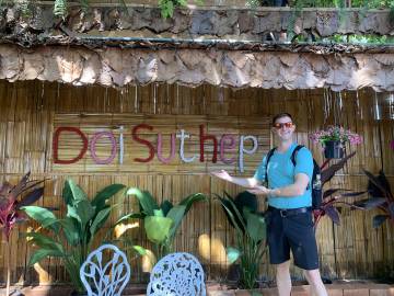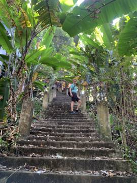 We saw a somewhat homemade looking sign to Doi Suthep and followed the path it was indicating, but we noticed that there weren’t many (and eventually, any) other people on it. For a moment we thought that we might be falling victim to another “common scam in Thailand” where an enterprising con artist has their own entrance to a temple or other point of interest and charges admission, when it turns out that there is actually no admission charge. But we carried on because Scott spied some derelict and somewhat looking abandoned steps in the distance that appeared to go to the temple. We survived the stairs, huffing and puffing our way up the steep ascent, and then all of a sudden we were inside a monastery and saw that we were at a side entrance to the temple. The monk who we surprised did a double take and then gave us a smile and a thumbs up; evidently he approved of our backroads sneak route to the temple.