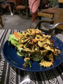 We had decided to try out Tikky Cafe for dinner, based on the recommendation from American travellers that we had met on our first night in Chiang Mai. We chose to walk the 3.5 km there to see more of the city. Along the way we passed a “Women’s Massage Center by Ex-Prisoners” and were perplexed as to what the heck that meant. Massages only for women? Or by women? Women “ex-prisoners” I suppose? So many questions. (Ahh, a quick Google search reveals that it is staffed by women who were formerly incarcerated and received vocational Thai massage training in prison.) We reached the restaurant and sat outside to wait for a table because it was quite crowded (always a good sign).