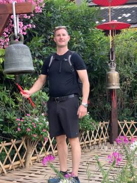 Disappointed by the inability to see anything exciting, we wandered off to see what else lay on the temple grounds. Not seeing anything particularly captivating other than some stray temple dogs, we decided to start our descent, this time opting for the 306 stairs of the Naga Staircase. At the base there was the typical Thai collection of souvenir shops and snack stalls and we each got a coconut smoothie for the return trip. We soon found our South Korean friends and the correct taxi and headed back into Chiang Mai.