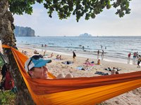 Despite all odds, we somehow arrived alive and were dropped off across the street from the DeLoft hotel where we then had to play Frogger, and bobbed and weaved across the four lanes of traffic without dying. We survived this as well and then were able to check in. The room was spartan but functional. By this point in the trip I had come to the realization that all beds in Thailand were very hard and had reluctantly accepted this fact, and this bed was no exception. We stuck our hammocks in our daypacks and headed out in search of Ao Nang beach which was just 1.5 km away.