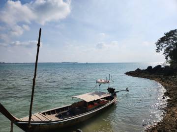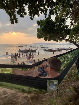 We could hear the beach before we could see, or rather, we could hear the infamous longtail boats whose repurposed automotive engine motors created an obnoxious din as the boats taxied tourists from one island to another. We hung the hammocks in trees near where the beachfront met the road that led to the resorts and we each took turns1 taking a dip in the Andaman Sea.