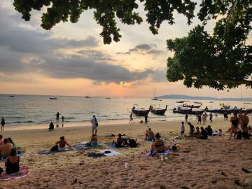 The beach was absolutely packed which made for interesting people watching and the longtail boat traffic was wild. There was a steady stream of them constantly coming and going, and while we had learned from YouTube travel videos that they were prolific in their numbers and in their racket, we didn’t get a true sense of it until we saw it in person. They would pull up onto the beach and throw their anchors at the water’s edge, deposit some passengers who then waded to shore, wait a few minutes, then load their next haul of passengers and take off across the horizon to some other place- most likely Railay Beach which was close by.