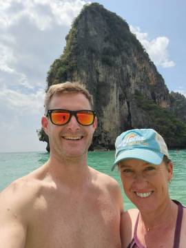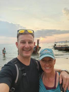 We hung out on the beach and in our hammocks long enough to catch the sunset over the bay and then decided to go in search of some dinner. Scott had read about a food market near the beach so we went in search of it. As we walked through the beachtown of Ao Nang we quickly sensed that we were in the Thai equivalent of Myrtle Beach, just with better scenery, with the iconic limestone karsts as a charmingly redeeming backdrop and antidote to the seediness of the town. I might have been hangry by this point so it felt like we walked for miles, but we finally found the food market and picked a stall to order from. The food was good and refueled us for the walk back up the hill to our hotel.