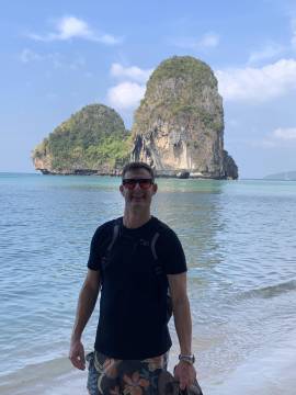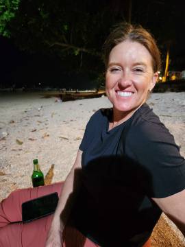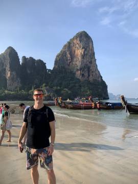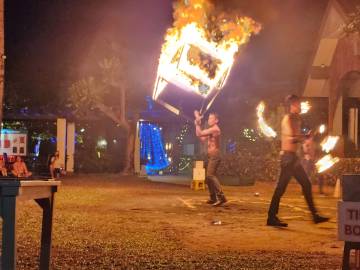 We headed back to our hotel for a shower before venturing back into town for dinner at a spot near the beach. (We walked so much this day- it was our record for most steps taken during the whole trip at almost 25,000!) On our way to the restaurant we booked a catamaran trip for the next day at a kiosk in town. We then enjoyed a sit-down dinner and after, picked up some cold Chang beers3 to sip while sitting on the beach while we were waiting for the fire show that was hosted by a local beach club to start. While waiting we actually saw that another fire show was happening further down the beach so we strolled down to watch and were suitably impressed. When that one finished we headed back up the beach and we got front row seats on the lawn and were thankful that we had, because what a show it was! These guys were unbelievable and took their fire show to the next level compared to the warmup act that we had watched a few minutes before. I even got to hold one of the props while one of the performers held the other end of the spinning ring of fire. When it ended we made the 1.5 km trek back uphill to our hotel, exhausted from all the walking but also from all the fun that we’d had exploring Ao Nang and Railay.