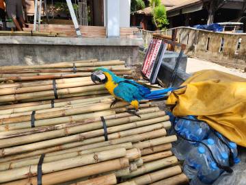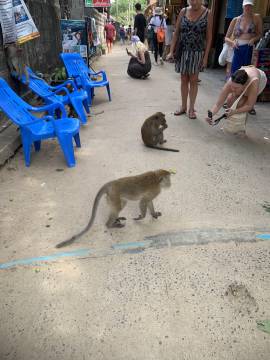 We retraced our steps and eventually reached an intersection near a floating dock and another spot where longtail boats and some other larger boats were dropping passengers off. We saw several areas where rock climbing lessons were taking place and while watching that, had our first monitor lizard and monkey spotting! The macaque monkeys would jump out of trees and land with a huge “thud” on the rooftop of the bathroom, before scrambling into the overhanging trees and climbing up the mountain. (Being inside the bathroom building while they were doing this was rather interesting and quite loud!)