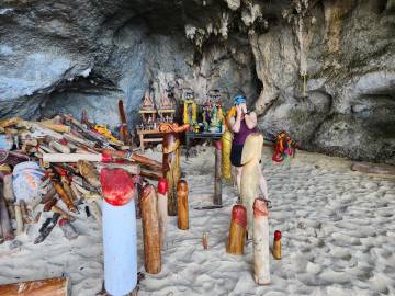 The next morning we got up early so that we could be on one of the first waves of longtail boats transporting travelers to Railay Beach, a nearby peninsula that is only reachable by boat. (If you see Scott in person, ask him to say “Railay.” It has become his favorite word; “Ao Nang” is a close second, and he now says “Ao Nanggggg” when “Aw, dang!” would be an appropriate response.) Taking an early boat turned out to be a good idea2 because it was less crowded when we arrived about 10 minutes later in Railay. The towering karsts were impressive to finally see up close and gave the impression of kudzu covered highrise buildings jutting straight out of the ocean and looming large overhead. We knew to head through the center of the little village of Railay to get to the other side for the famous Phra Nang beach that was home to a rather, um, titillating point of interest, the Phra Nang Cave, that has somehow come to be a shrine to fertility, and um, has a lot of, uhh… You know what? Just click on the link I included, just not from a work computer.