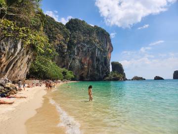 By the time we finally reached Phra Nang Cave and beach, it was pretty crowded. Luckily there was not as much boat traffic on this side of the peninsula so it was much quieter. We took a brief peak into the cave to see all of the, um, unique offerings that had been left in it, took the requisite pictures, and then ventured off in search of a good place to hang our hammocks along the beach. We had to take turns swimming again since this beach was a prime spot to have your stuff stolen. The water was a clear turquoise and was stunning. There was a sandbar that you could wade waist deep along that led you to one of the huge karsts that had its own sandy beach. We spent several hours enjoying the beach, thoroughly soaking in both the sun and the surreal scenery, before deciding to eat a bite for lunch overlooking the bay, and then catch a longtail boat back to Ao Nang.