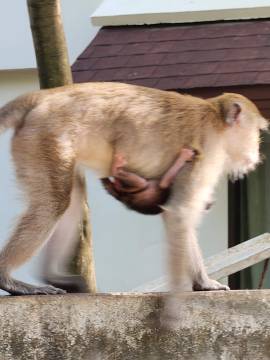 Along the pathway as we were heading back from lunch, we encountered an entire rowdy troop of macaques. I was thrilled to see them and even more thrilled to witness the moment that one of the rowdiest of the bunch plucked just-purchased food right off the plate of an unsuspecting tourist while baring his teeth at her, daring her to fight him off. The signs that were posted all over the island warning of aggressive monkeys were not put there just because. They were indeed aggressive. It was entertaining (and slightly unsettling) to watch them climb and swing on the electric utility wires above our heads. We saw one monkey that was perched atop a fence gnawing on part of a chicken carcass be chased by a mother monkey, her infant clinging tightly to her chest as the chase ensued. I could have sat there for hours and watched them but Scott summoned me and we headed through the shops of Railay (bustling and alive now that it was later in the day) and to the water’s edge for our water taxi.