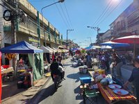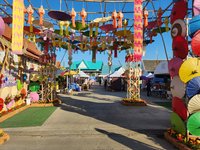 We started off by checking out the Umbrella Making Centre- part store, part museum, and home to artisanal umbrella makers busy weaving, webbing, assembling, and painting the delicate paper umbrellas, not a single one of the craftswomen less than the age of 75. After investigating the center we wandered into the festival proper which was still being set up. As the afternoon turned into evening the foot traffic increased and it became impressively crowded. The amount of umbrellas on display was splendid and they made a spectacular decorative backdrop, colorful and creatively themed. My favorite of all was the Moo Deng themed umbrella.