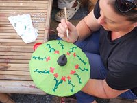 We came across some more interactive booths and Scott was able to swirl his choice of paint colors onto water and a festival volunteer then dipped a folding paper hand fan into the water. His fan came out with loops and splashes of red, purple, and yellow. They stuck it in a plastic bag for us and we carried on. We then encountered a station where you could paint your own umbrella. Scott suggested I do it and I was resistant at first, for the very practical reason of not wanting to get paint on my clothes. He harassed me until I gave in. I picked out a lime green umbrella and sat down at the table. I painted some vines and flowers on my umbrella and was actually pleased with how it turned out. I carried it around the rest of the evening and was careful not to touch the wet paint and was proud of myself for not getting paint on myself.