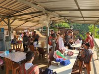 The leaders then told us to head back up to the pavilion so that we could do the next activity. We then gathered round a table and were shown how to make vitamin and mineral enriched elephant treats to supplement their diet. We took turns mashing up the pellets, tamarind beans, and bananas with a huge wooden mortar and pestle, balling up the resulting mash, and then wrapping the mash balls with banana peels. We were then sent to change into our bathing suits.