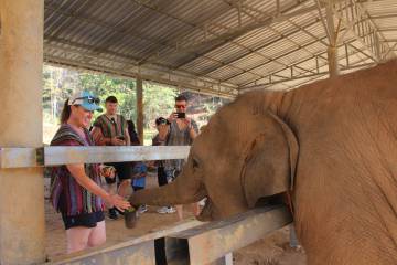 When we finally arrived at the Elephant Jungle Sanctuary facility in Mae Wang, we were instructed to make our way to the pavilion and to put on “traditional Karen wear.” Karen wear turned out to be colorful woven tunics named after the Karen tribes of the area, and they would protect us from getting muddy2 while we first fed and interacted with the elephants. We donned the tunics and then admired the herd of elephants from afar before sitting down to receive our briefing. We were given a brief informative session about Asian elephants- diet, habitat, anatomy, how they differ from African elephants, gestation, life expectancy, etc., that I of course ate up and did some follow up reading on later. The next part of the briefing focused on how to stay safe in our interactions with them. Finally it was time to make our way into their grassy pasture to feed and meet them!