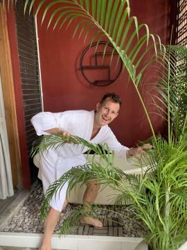 We started off the day by sleeping in so that we would be rested heading into the festivities and the long haul flight home early the next morning, as well as to let Scott get as much rest as possible since he wasn’t feeling 100%. It was now his turn to take a soak in the balcony tub and for a guy that isn’t into baths, he sure did seem to enjoy it and was more than happy to pose with all sorts of props I threw his way.
