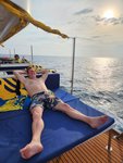 The catamaran was just as luxurious as the promotional materials had promised and we were escorted to our assigned seats that were perfect for lounging and soaking up the sun (or shade if you got too hot) and given a welcome drink. The cushions and pillows and color scheme added a level of poshness and made for lovely photos… especially with the dramatic limestone karsts of the Andaman Sea in the background. We settled in before going to check out the rest of the boat. It had an upstairs that was similar to our deck and the front lounging area had several types of comfy seating in addition to its “trampolines,” and even had bean bags that could be taken onto them.