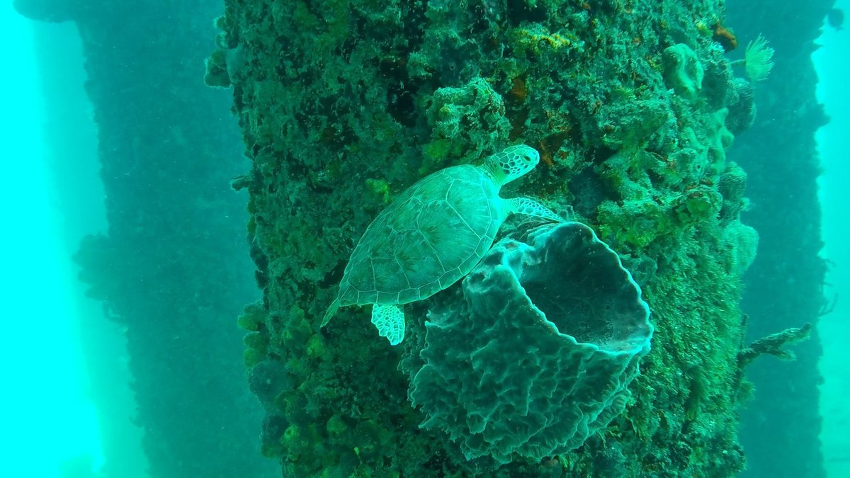 While I was teaching the morning sessions he went on his last dive at the Fredriksted cruise pier and it turned out to be his best and favorite one of the week. He was out for a little over an hour and came across a puffer fish and a little sea turtle that was perched atop some coral on one of the pier piles sleeping. His most exciting discovery of the dive was a trio of octopuses and he was able to watch them for a few moments, fascinated by their ability to change their color on demand to correspond with their surroundings as they glided around the seafloor.