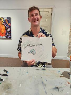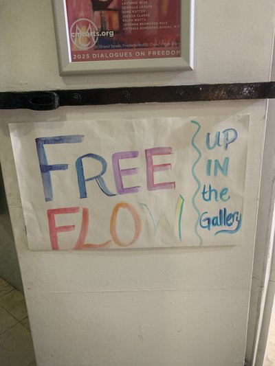 We went into the Caribbean Museum Center for the Arts, a gift shop/art gallery featuring works and pieces from local artists that I’d spied earlier in the week but never got a chance to visit since it had always been closed until this evening. Scott asked the clerk about the festival and she also told him about the “Free Flow” session they were hosting upstairs. Participants were invited to “unleash your inner CREATOR” and try their hand at art. She hadn’t even gotten the words out of her mouth before Scott was bolting up the stairs, leaving me in a cloud of dust. I trailed after him trying to see where he had gone and found him upstairs talking with the volunteer docent.