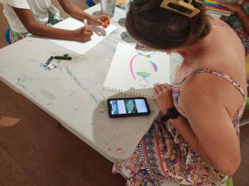 Tonight’s medium for the public was oil pastels and she sat us down at a table with some other budding artists and handed us paper and directed us to the crayons. Scott brainstormed with her about what he should draw, and he decided to depict one of the octopuses he had spotted on his morning dive. He jumped right into it. I thought for a moment about what I wanted to draw and settled on a purple and teal parrotfish I had seen on our Buck Island snorkel. As we sat drawing our chosen sealife, I was reminded of a similar festival art experience we’d had when I painted a paper umbrella at the Bo Sang Umbrella Festival outside Chiang Mai in Thailand.