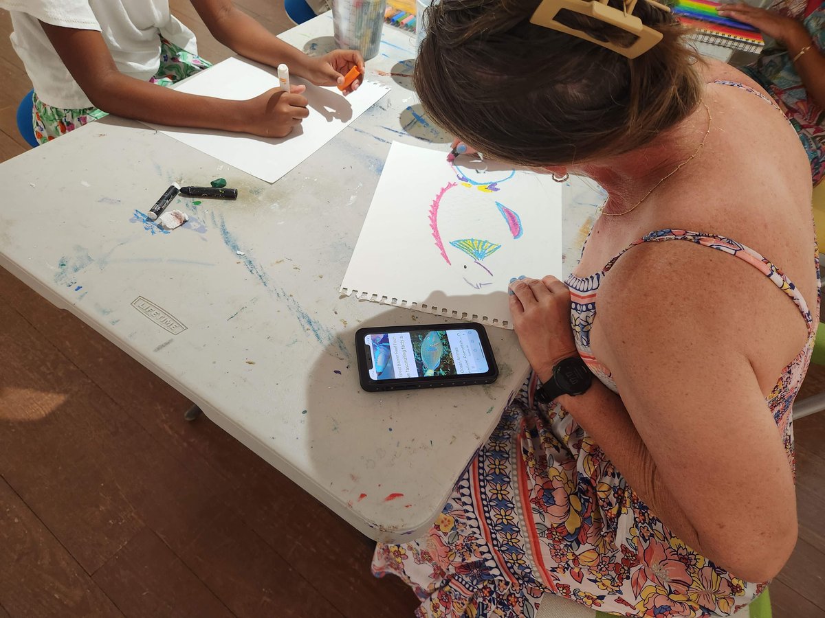 A gregarious little girl took the seat directly across from me and sat thoughtfully staring at her blank paper before finally looking up at me, making eye contact, and asking if I would mind if she drew me. I gave her my blessing, amazed at her confidence. I had Google’d a picture of a parrotfish1 and set about drawing it as Scott worked on his octopus. We both eventually finished and I reluctantly informed the girl that we were leaving. She assured me that it was ok because she knew what I looked like and would be fine and showed me what she currently had before we told her goodbye and headed in search of dinner.