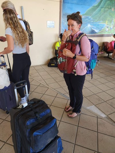 When we got to the airport we said goodbye to Jane and then tried to figure out how to check Scott’s dive bag. The STX airport is mostly open air prior to customs and security and when we figured out the baggage check situation the agent informed us that our bag was 8 lbs over. We had packed the dive weights in the bag so we grabbed them out to help make weight. This brought the bag into an acceptable range. She tagged it and then instructed us to carry it over to the customs line ourselves. In a moment of sneakiness I decided that no one (aside from the guy that had to lift the bag into the airplane) would know we put the weights back into the bag since it was already tagged as “acceptable” so I did exactly that. I am one rebellious rebel.