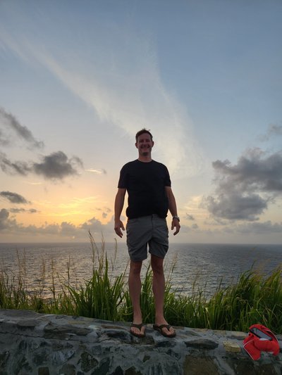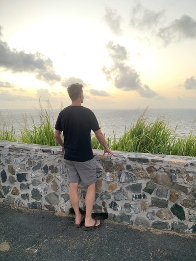 We woke up obscenely early this morning and hit the rough Cruzan roads by 4:30 AM to make our way to Point Udall, the easternmost spot in the United States, to catch the sunrise. It took us every bit of the hour we had allotted, and we arrived just in time to join the crowd of 50 or so other people who had gathered there before us to watch the sun make its way up, emerge above the horizon, and eventually break through the clouds. After we had done this “thing you’re supposed to do in the place you’re supposed to do it” we headed back toward Christiansted in search of breakfast. We were initially puzzled that many of the breakfast spots that had come recommended in Scott’s research weren’t open until we remembered that today was a holiday: it was Juneteenth. We eventually found a breakfast spot in downtown Christiansted that was open and sat outside on their patio and had breakfast before returning back to Fredriksted for me to teach.