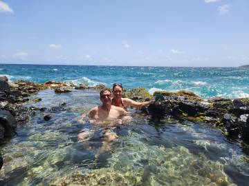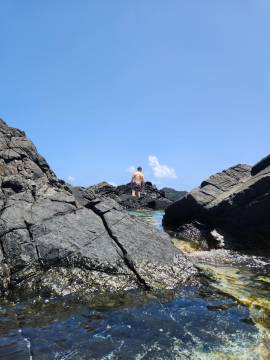 We put our stuff down and stripped to our bathing suits and waded in. We were glad we had kept our shoes on because it was rocky and there were sea urchins perched between rocks that would not feel good to step on. I did end up tangling with one when I put my hand down on an underwater rock to navigate my way through the pool and got pricked, and a few minutes later noticed that the heel of my hand didn’t have any feeling, the sea urchin’s venomous spine had numbed it. After that I was much more careful at scouting for them.